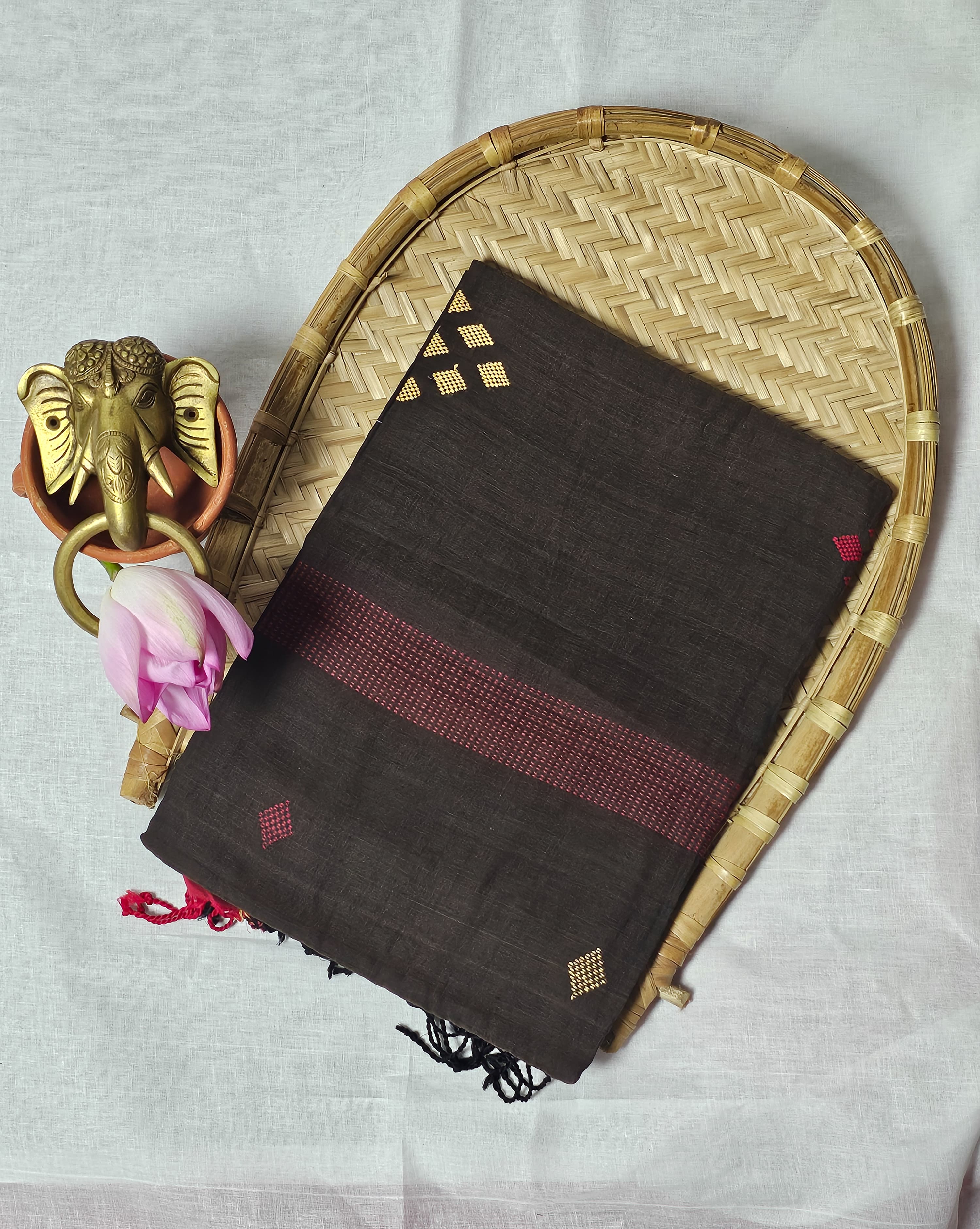 Elevate your ethnic wardrobe with this exquisite Handwoven Brown Tangail Pure Cotton Saree. Crafted by skilled artisans, this lightweight and breathable saree is perfect for all-day comfort. Its rich brown hue adds a touch of sophistication, making it ideal for casual wear, office wear, or festive occasions. Made from 100% pure cotton, this traditional Tangail saree drapes beautifully and ensures effortless elegance. Pair it with statement jewelry for a timeless look