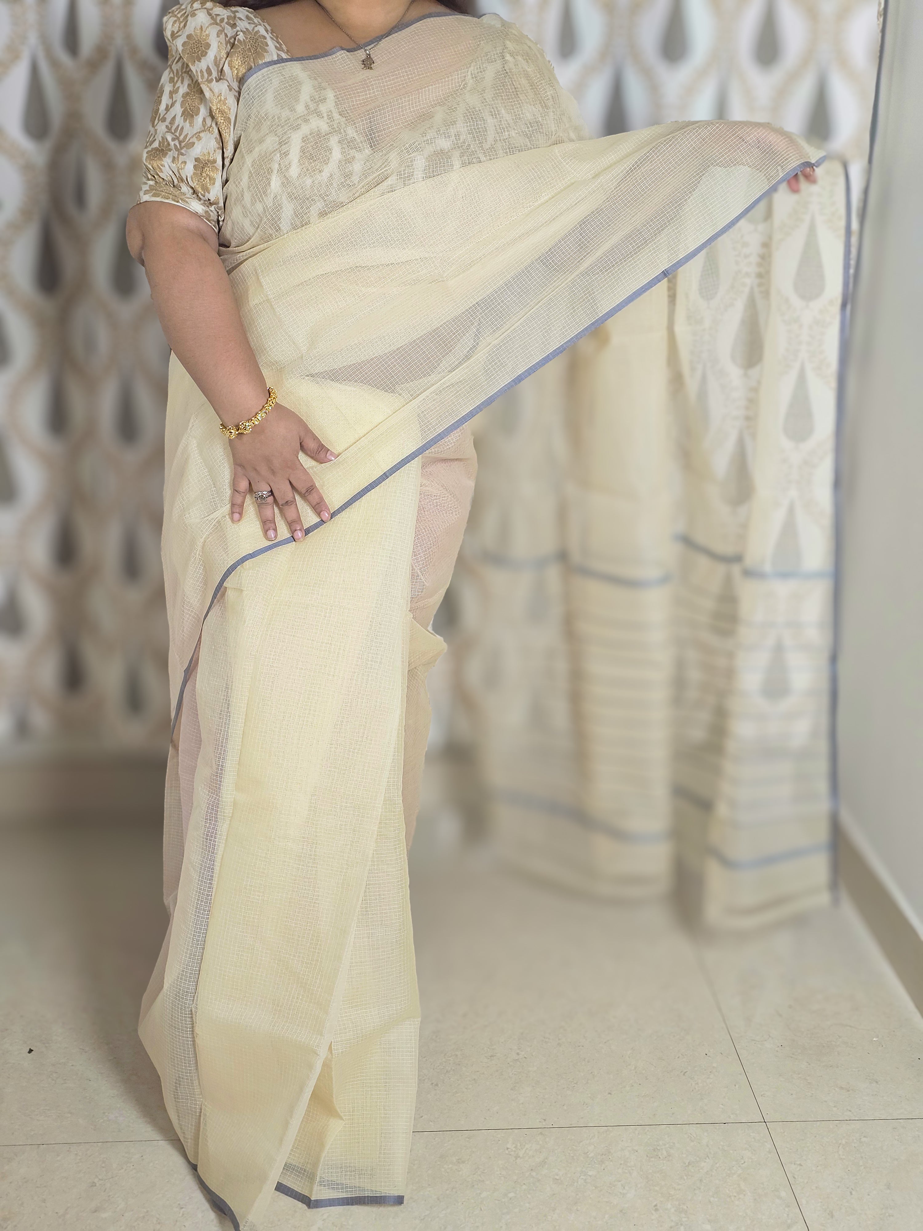 Discover the charm of traditional craftsmanship with this Handwoven Kota Doria Sari in pure cotton. Designed for comfort and elegance, this sari features a stylish grey border, adding a modern yet timeless touch to the classic Kota doria fabric. Perfect for daily wear, office events, or casual gatherings, this sari is lightweight, breathable, and exudes effortless grace. The pure cotton fabric ensures a smooth feel, making it an ideal choice for those seeking both comfort and style.