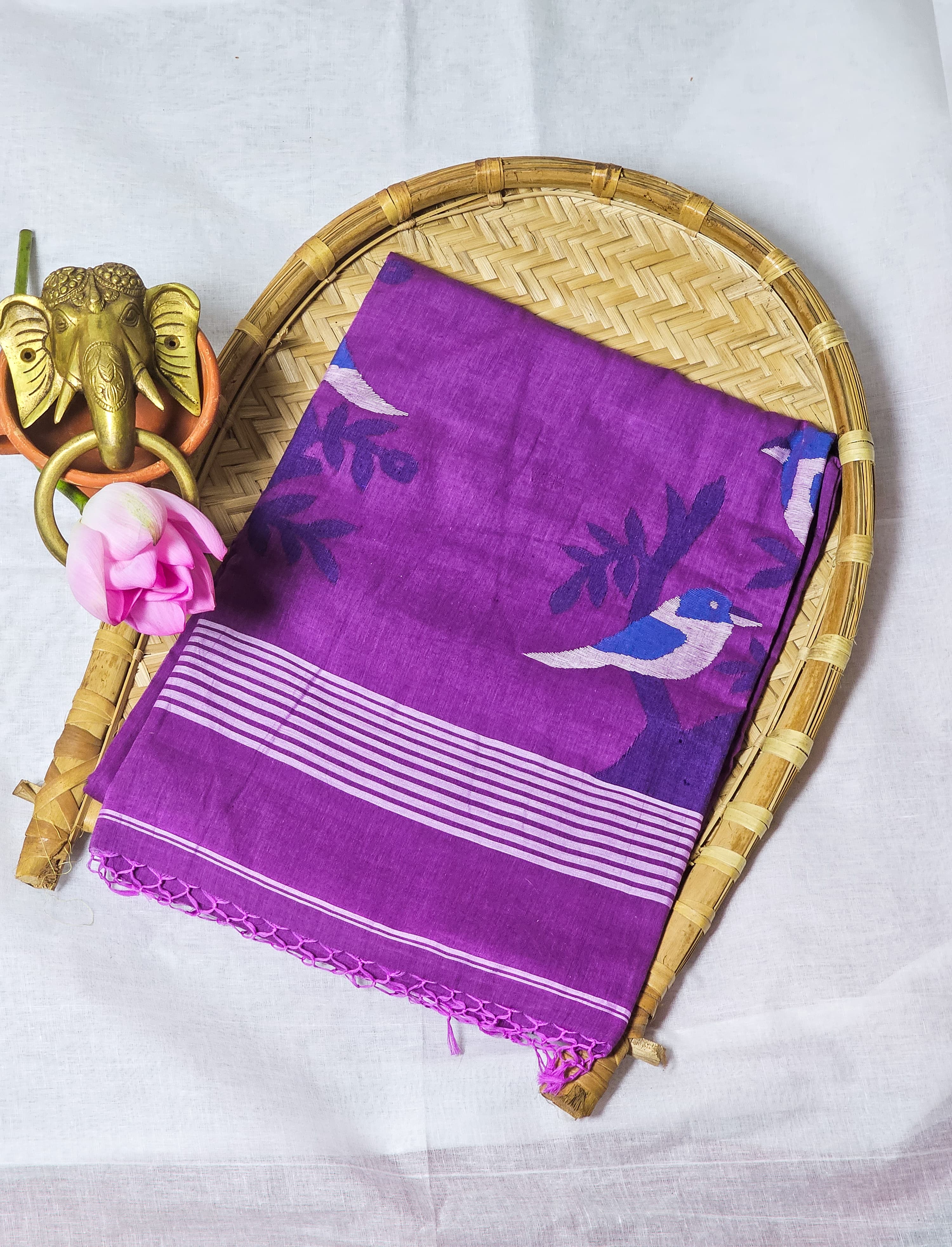 Embrace the elegance of tradition with this Handwoven Purple Tangail Saree, crafted from pure cotton for a soft and breathable feel. Featuring intricate Jamdani weaving, this saree showcases exquisite craftsmanship that reflects the rich heritage of Bengal. The beautiful purple hue, combined with the detailed weaving, creates a timeless look perfect for festive occasions, cultural events, or weddings. This lightweight saree offers both comfort and style, making it a must-have addition to your collection.